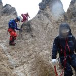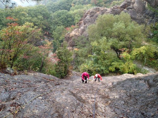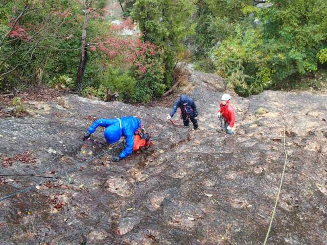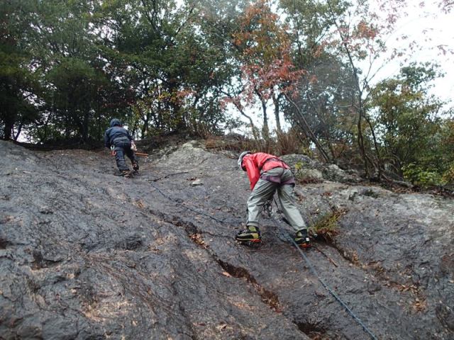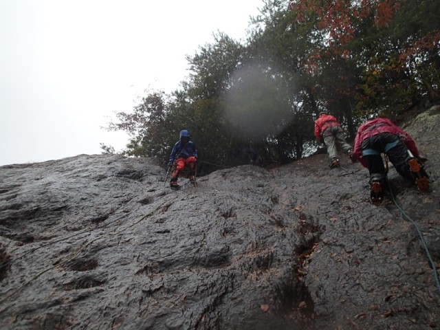 次は、大屏風岩の緩斜面にフィックスロープを張って、通称(?)猿回しのトレーニング。下りではフラットフッティングや重心をしっかり下げることを、登りでは安定したフロントポインティングなどを意識しながら、繰り返し練習しました。なかなか難しい。