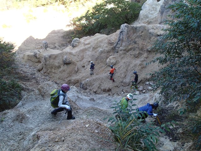 柔らかく脆い砂場や、傾斜の強い岩場などを歩き回ります。終わる頃にははじめの頃よりアイゼンを履いた歩行に慣れたようでした。