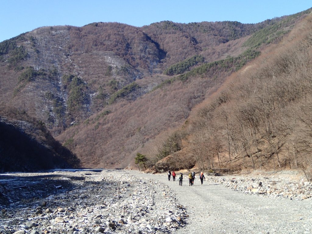 長い河原歩きの果てに12時50分、無事下山完了。夏合宿は雨の為、一泊で終わってしまったBチームとしては、冬合宿が初めての2泊の山行で、歩く距離も長く、ラッセルもしっかりできたとても内容の濃い合宿となりました。ご指導いただいた先輩方、ありがとうございました。
