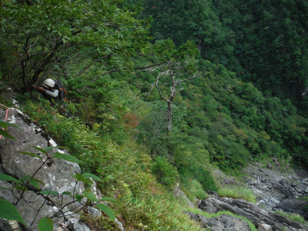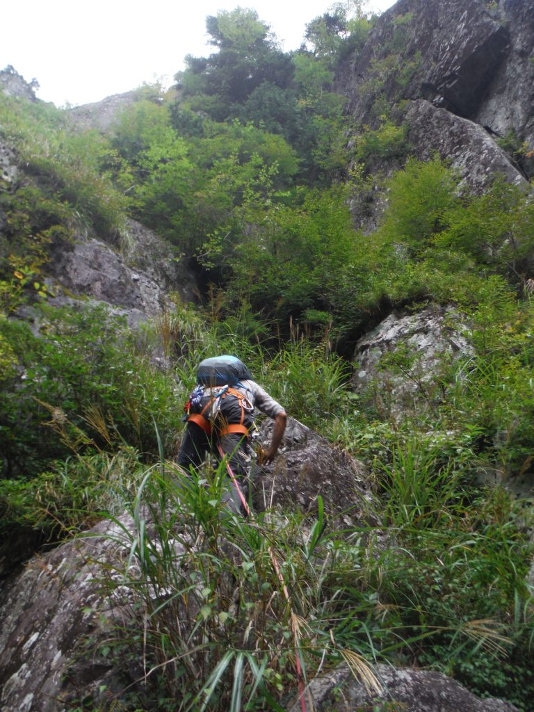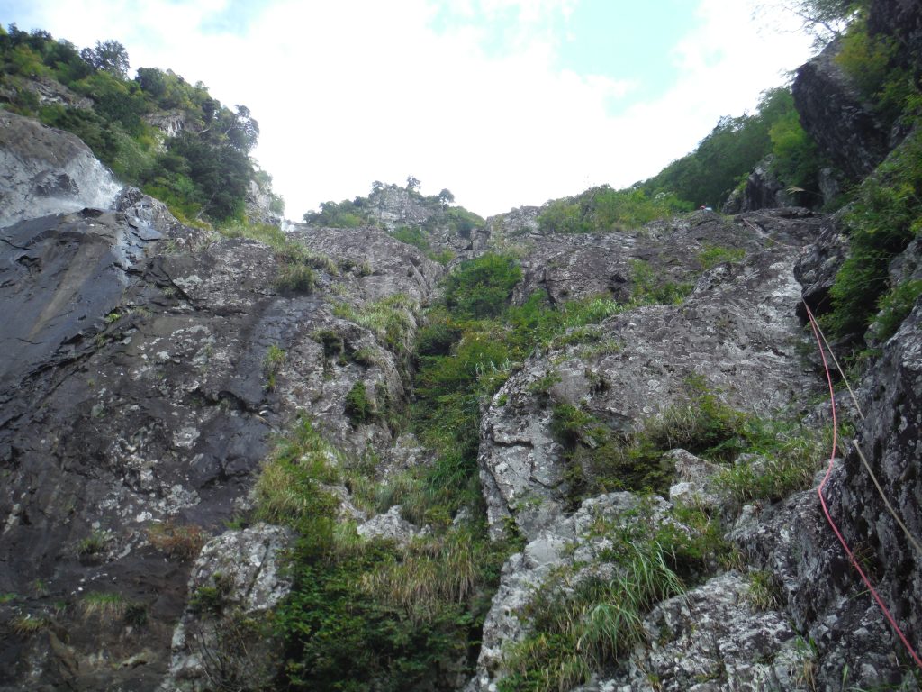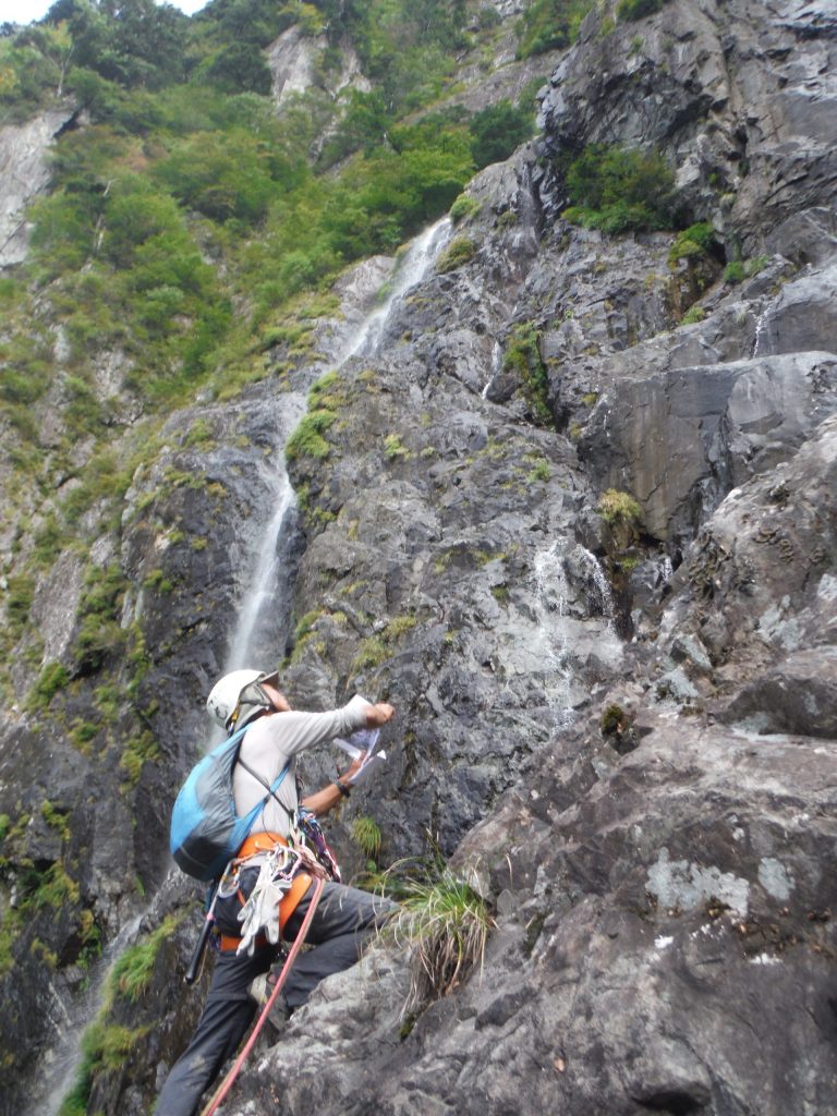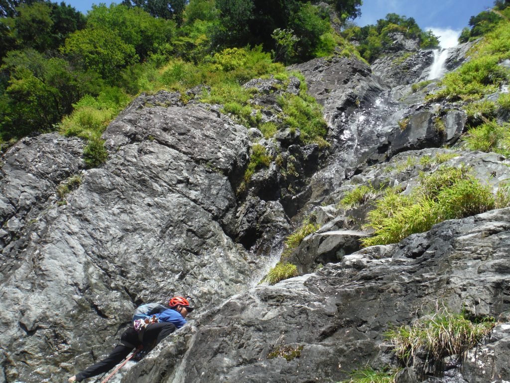 この滝の岩はおおむね硬く安定していたが、藪に点在する壁は脆く気を使った。