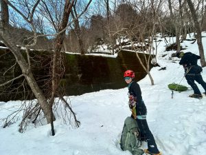 堰堤を目印に取り付きまで上がると、すでに1パーティが先行してスタートしていた。