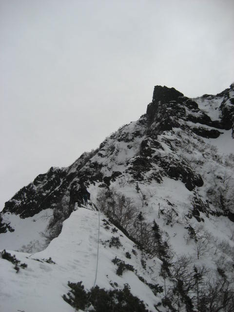 | 8:30 | 南沢登山道(かなり行者小屋にちかいところ)でようやく樹林帯に入る。 しばらくして涸れ沢に出る。涸れ沢沿いにトレースあり。 トレースをたどるが一向に樹林帯に入るようすなく、引き返して適当なところから 樹林帯の急登をラッセルする。露岩のずいぶん下に出る。ここでハーネス装着。 |