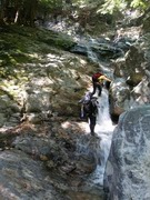 「美しいナメ」で休憩後、右岸を高巻き、懸垂(10m)で沢に戻る。