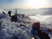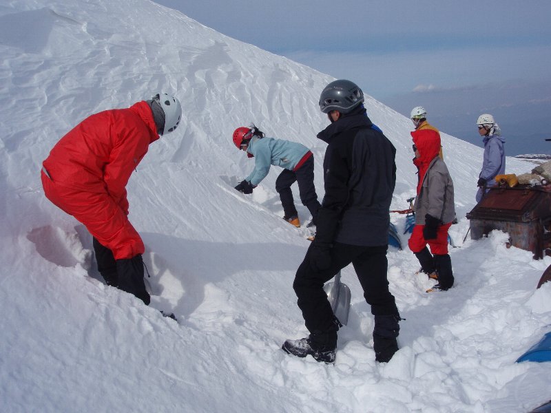 | また、木曽駒ヶ岳の頂上小屋周辺で10人用の雪洞を掘りましたが、 完成するまでに3時間を要しました。 両日とも天候に恵まれ、雪上訓練や雪洞経験だけでなく、 360度広がる澄み渡った景色を堪能しました。 |