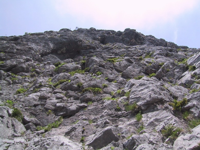 | 9ピッチ目X: | 最初のピンまでが遠く、バランスも微妙で注意。 先行パーティーがいるとすぐ上の中央バンドからの落石に要注意。 この辺りで奇数ピッチのほうが難しいことに気付く。 |
