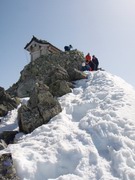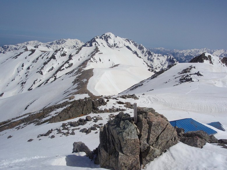 別山を過ぎ、剱御前小屋が見えてきた。あとは雷鳥沢を下りるだけだ! 下から見上げていた時は、こんな坂下りるの怖いやろな〜と思ったけど、 下り始めたらそんなでもない。それなりに楽しい。もうしばらく雪には会わないと思うので、 最後?の感触を楽しみながら、テント場に向かった。